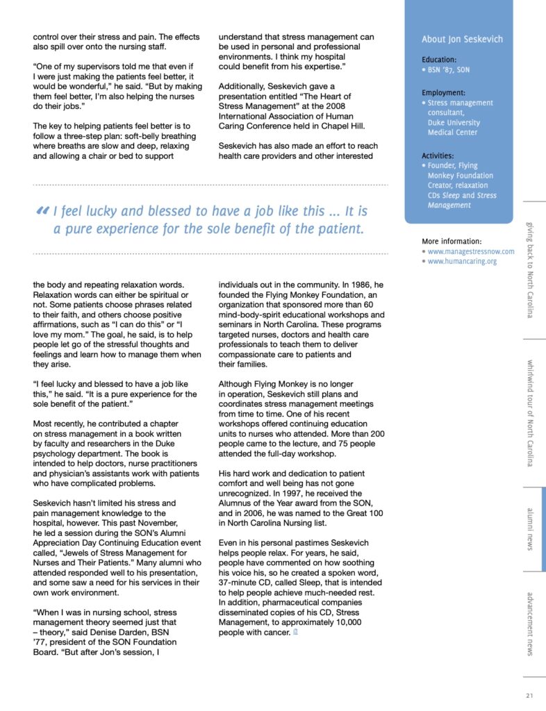 From UNC School of Nursing to Duke Hospital Stress Management Nurse Clinician Carolina Nursing Fall 2008.- “Noteworthy Nurse” is about alums of UNC School of Nursing“who have contributed much in their chosen area of nursing.” “Noteworthy Nurse: For one SON graduate, helping others relieve stress comes naturally.”