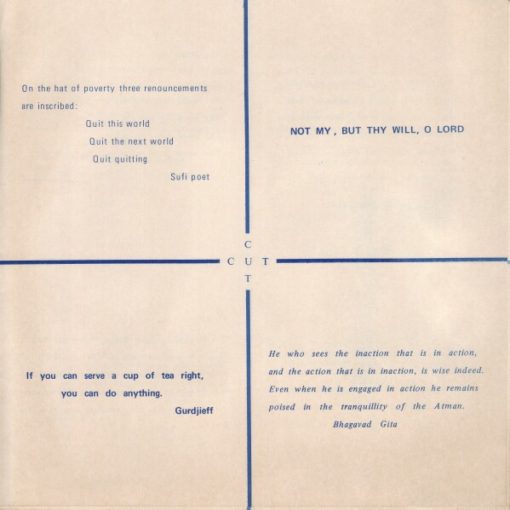 A long playing record was also included in the FBTO box. Elektra Records produced and manufactured this recording. Jac Holzman, of Elektra Records appreciated Ram Dass a great deal. The album label has a special thanks to Elektra Records for producing the album without charge. An Elektra Records Discography website reports “about 200 copies were pressed up by Elektra…” I have not been able to confirm this number. In fact with 10,000 box sets distributed, it would seem that many albums were made at no charge for Ram Dass. The biggest type on the record label says “This Record Is Not For Sale.” There was also another record on the Elektra Label with the same number, it was a sampler of the group Bread.